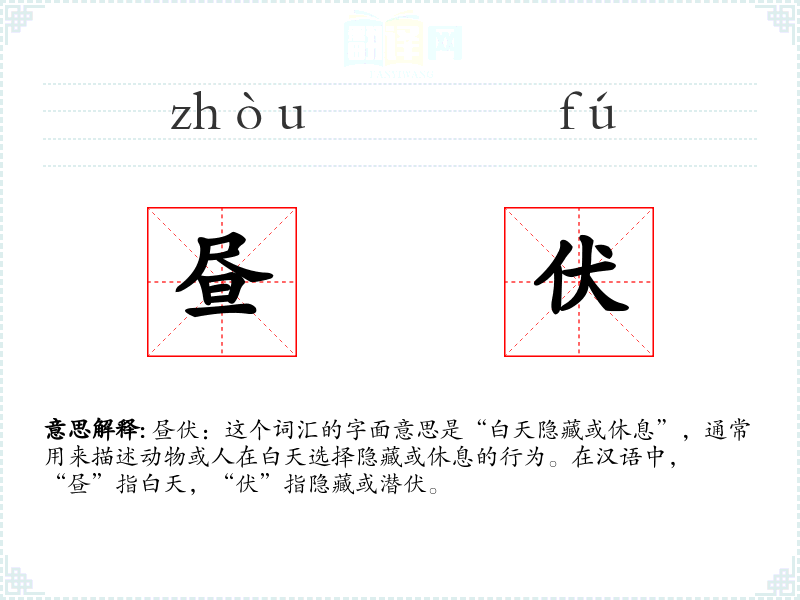 昼伏:这个词汇的字面意思是“白天隐藏或休息”,通常用来描述动物或人在白天选择隐藏或休息的行为。在汉语中,“昼”指白天,“伏”指隐藏或潜伏。
