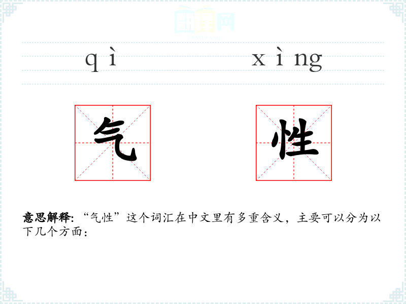- 生理上的气性:指的是人的脾气、性格,尤其是指容易发怒或情绪波动的倾向。