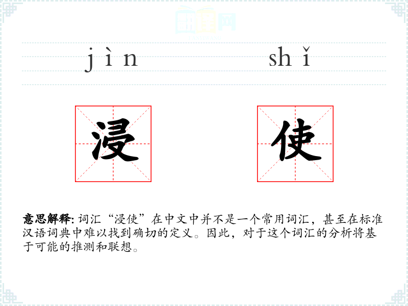 词汇“浸使”在中文中并不是一个常用词汇,甚至在标准汉语词典中难以找到确切的定义。因此,对于这个词汇的分析将基于可能的推测和联想。