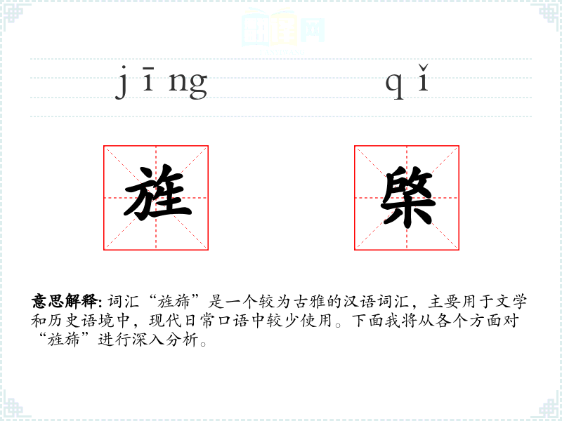 “旌旆”(jīng pèi)字面意思是指古代军队中的旗帜,特别是指挥官所用的旗帜。其中,“旌”指的是用羽毛装饰的旗帜,而“旆”则是指下垂的旗帜边缘。