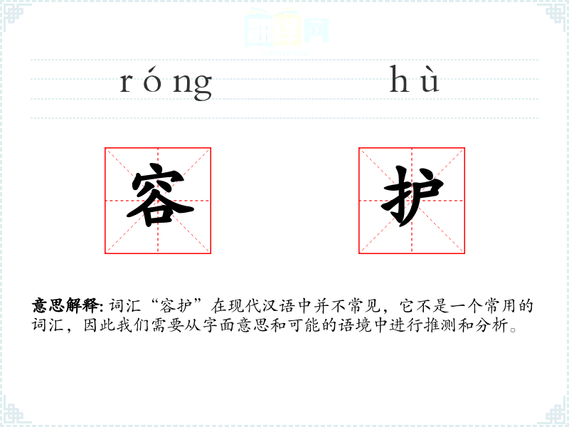 词汇“容护”在现代汉语中并不常见,它不是一个常用的词汇,因此我们需要从字面意思和可能的语境中进行推测和分析。