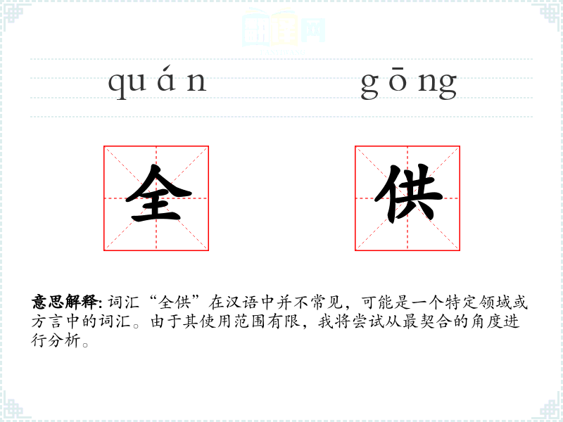 词汇“全供”在汉语中并不常见,可能是一个特定领域或方言中的词汇。由于其使用范围有限,我将尝试从最契合的角度进行分析。