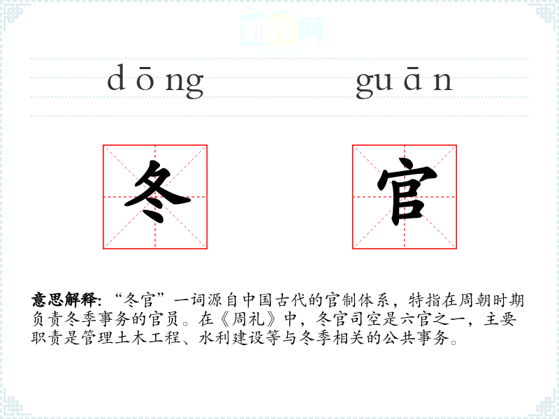 在文学作品中,“冬官”可能被用来象征冬季的严寒和静谧,或者比喻那些在寒冷季节中坚守岗位、默默奉献的人。在口语中,这一词汇可能不太常用,但在历史学、考古学等专业领域,它是一个重要的学术术语。