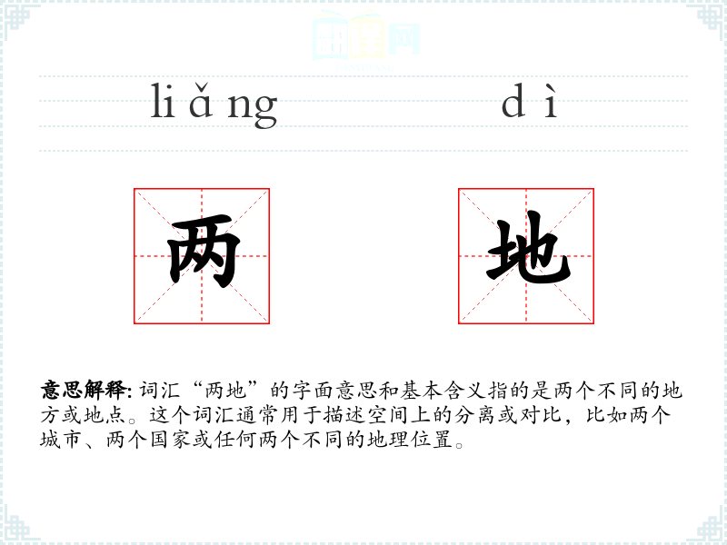 词汇“两地”的字面意思和基本含义指的是两个不同的地方或地点。这个词汇通常用于描述空间上的分离或对比,比如两个城市、两个国家或任何两个不同的地理位置。
