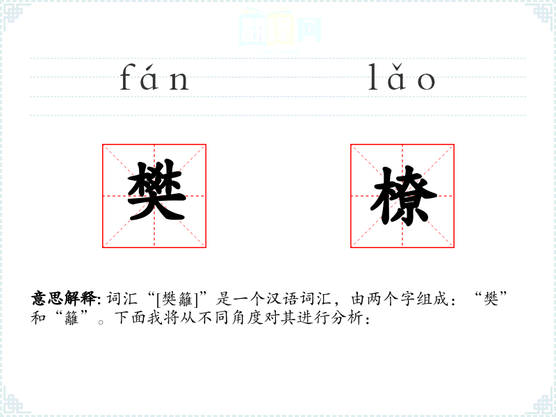 词汇“[樊籬]”是一个汉语词汇,由两个字组成:“樊”和“籬”。下面我将从不同角度对其进行分析: