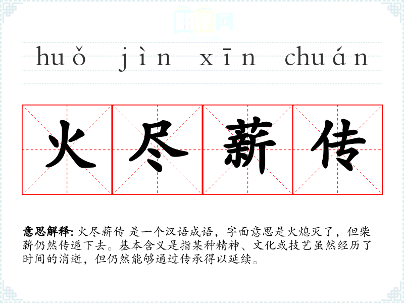 火尽薪传 是一个汉语成语,字面意思是火熄灭了,但柴薪仍然传递下去。基本含义是指某种精神、文化或技艺虽然经历了时间的消逝,但仍然能够通过传承得以延续。