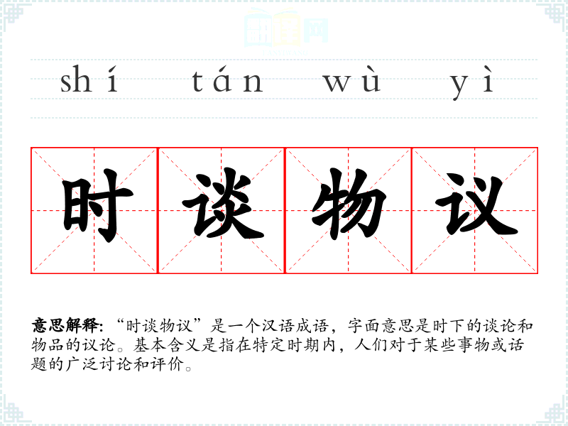 “时谈物议”是一个汉语成语,字面意思是时下的谈论和物品的议论。基本含义是指在特定时期内,人们对于某些事物或话题的广泛讨论和评价。