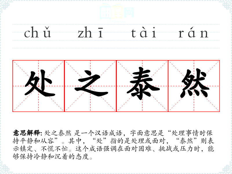 处之泰然 是一个汉语成语,字面意思是“处理事情时保持平静和从容”。其中,“处”指的是处理或面对,“泰然”则表示镇定、不慌不忙。这个成语强调在面对困难、挑战或压力时,能够保持冷静和沉着的态度。