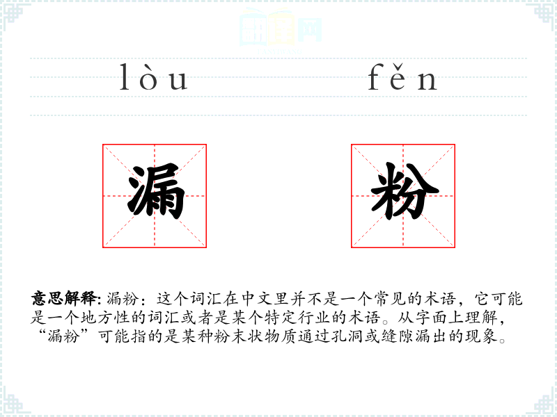 由于“漏粉”不是一个标准词汇,它的词源和演变难以追溯。它可能是由“漏”和“粉”两个字组合而成的,用以描述粉末物质的漏出现象。