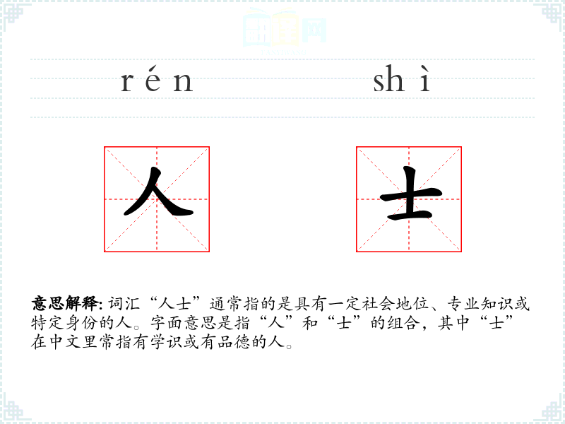 词汇“人士”通常指的是具有一定社会地位、专业知识或特定身份的人。字面意思是指“人”和“士”的组合,其中“士”在中文里常指有学识或有品德的人。