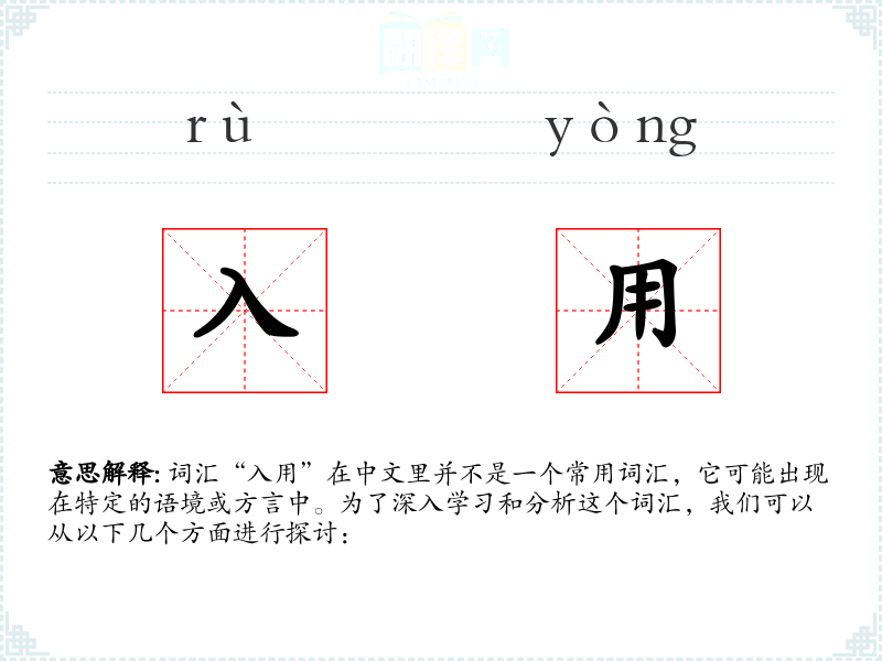 词汇“入用”在中文里并不是一个常用词汇,它可能出现在特定的语境或方言中。为了深入学习和分析这个词汇,我们可以从以下几个方面进行探讨: