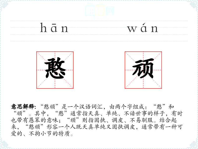 “憨顽”是一个汉语词汇,由两个字组成:“憨”和“顽”。其中,“憨”通常指天真、单纯、不谙世事的样子,有时也带有愚笨的意味;“顽”则指固执、调皮、不易驯服。结合起来,“憨顽”形容一个人既天真单纯又固执调皮,通常带有一种可爱的、不拘小节的特质。