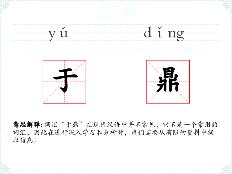 词汇“于鼎”在现代汉语中并不常见,它不是一个常用的词汇,因此在进行深入学*和分析时,我们需要从有限的资料中提取信息。