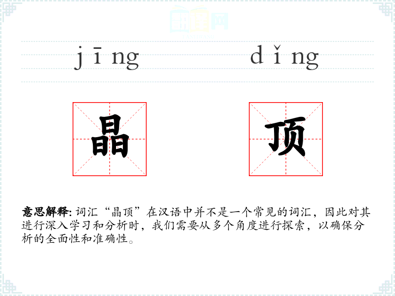 词汇“晶顶”在汉语中并不是一个常见的词汇,因此对其进行深入学习和分析时,我们需要从多个角度进行探索,以确保分析的全面性和准确性。