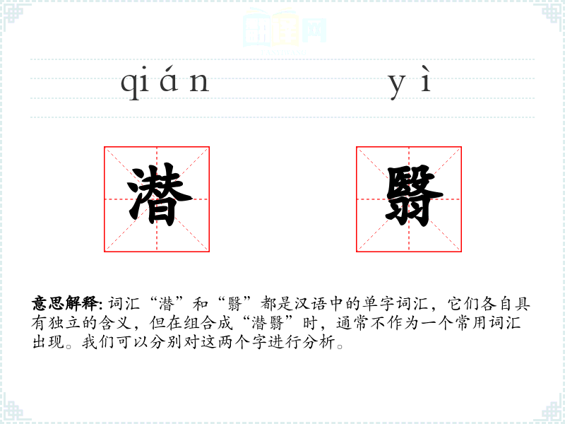 词汇“潜”和“翳”都是汉语中的单字词汇,它们各自具有独立的含义,但在组合成“潜翳”时,通常不作为一个常用词汇出现。我们可以分别对这两个字进行分析。