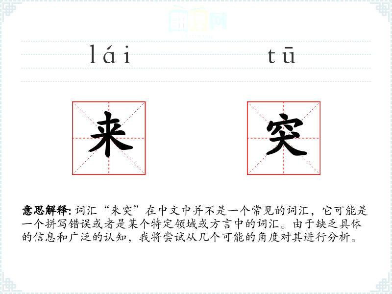 由于“来突”不是一个标准的中文词汇,我们无法给出一个确切的基本定义。它可能是由两个字“来”和“突”组合而成的,但这种组合在中文中并没有明确的意义。