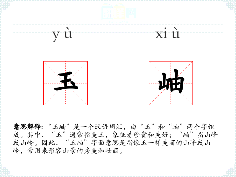 - 反义词:(由于“玉岫”主要用于正面描述,反义词不明显,但可以用“荒山”、“秃岭”等词汇来表示相反的自然景观)