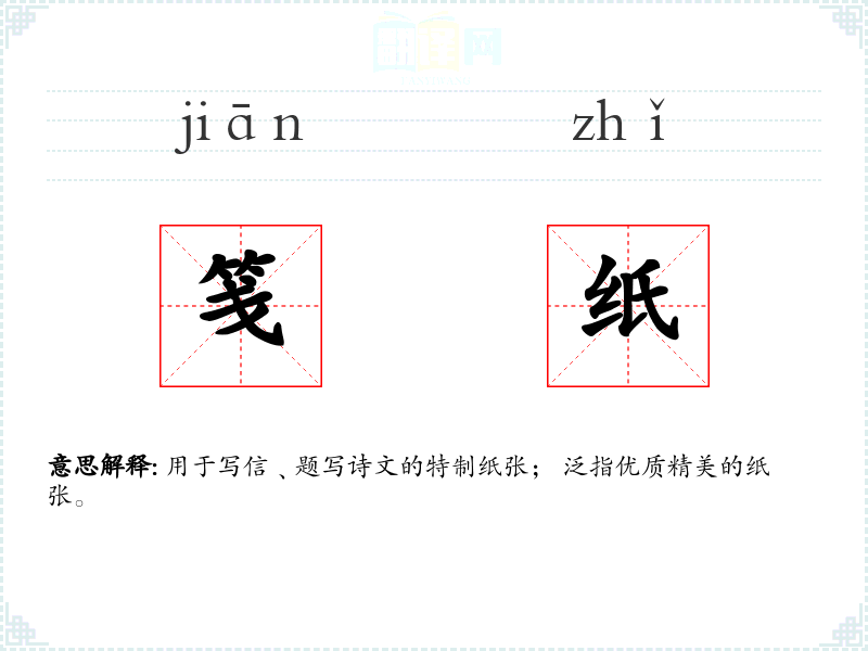 用于写信﹑题写诗文的特制纸张; 泛指优质精美的纸张。