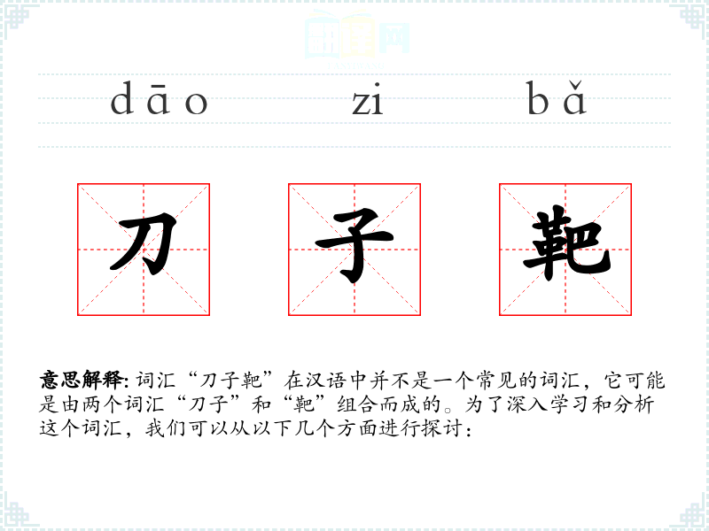 词汇“刀子靶”在汉语中并不是一个常见的词汇,它可能是由两个词汇“刀子”和“靶”组合而成的。为了深入学*和分析这个词汇,我们可以从以下几个方面进行探讨: