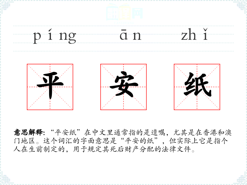 “平安纸”在中文里通常指的是遗嘱,尤其是在香港和澳门地区。这个词汇的字面意思是“平安的纸”,但实际上它是指个人在生前制定的,用于规定其死后财产分配的法律文件。