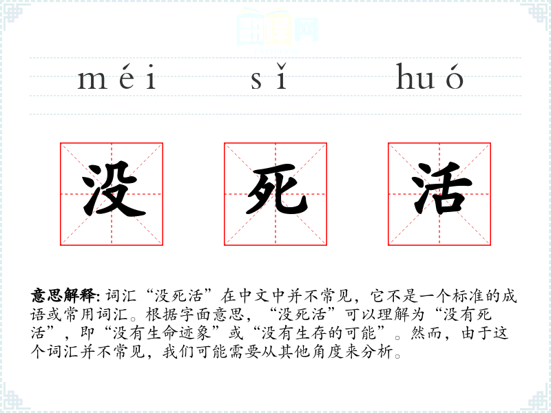 词汇“没死活”在中文中并不常见,它不是一个标准的成语或常用词汇。根据字面意思,“没死活”可以理解为“没有死活”,即“没有生命迹象”或“没有生存的可能”。然而,由于这个词汇并不常见,我们可能需要从其他角度来分析。