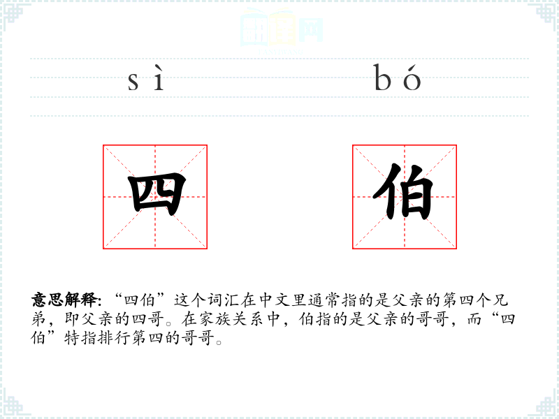 同义词:四叔(指父亲的第四个弟弟) 反义词:四婶(指四伯的妻子)