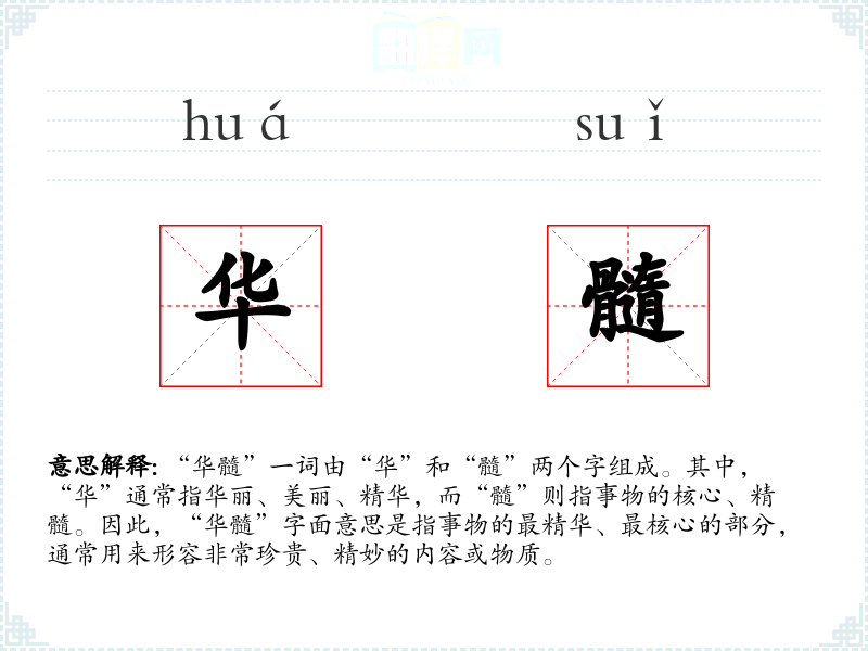 “华髓”一词由“华”和“髓”两个字组成。其中,“华”通常指华丽、美丽、精华,而“髓”则指事物的核心、精髓。因此,“华髓”字面意思是指事物的最精华、最核心的部分,通常用来形容非常珍贵、精妙的内容或物质。