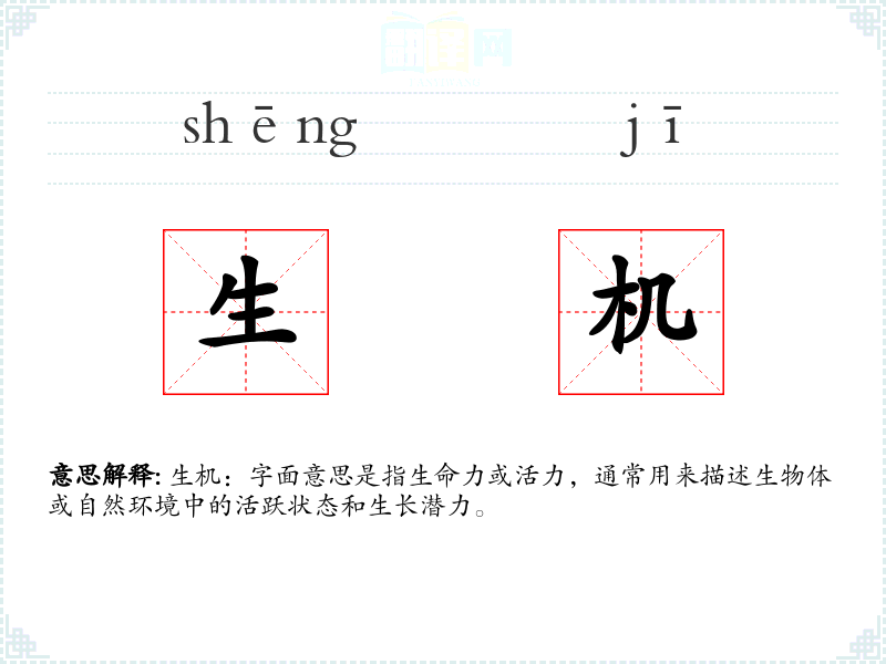 生机:字面意思是指生命力或活力,通常用来描述生物体或自然环境中的活跃状态和生长潜力。