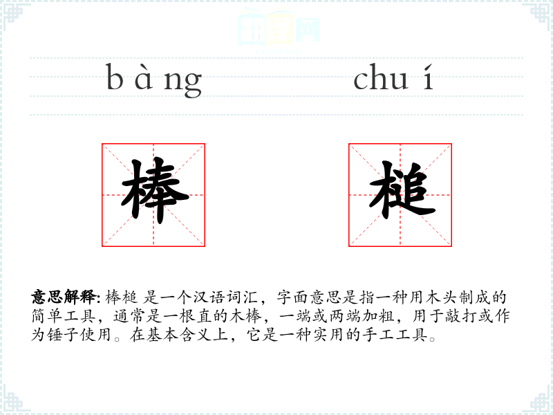 在英语中,类似的工具可能是“mallet”或“wooden hammer”,但它们在文化和语境中的使用可能与“棒槌”有所不同。