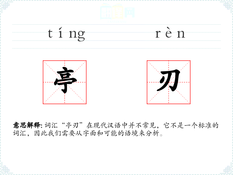 词汇“亭刃”在现代汉语中并不常见,它不是一个标准的词汇,因此我们需要从字面和可能的语境来分析。