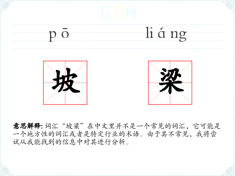 词汇“坡梁”在中文里并不是一个常见的词汇,它可能是一个地方性的词汇或者是特定行业的术语。由于其不常见,我将尝试从我能找到的信息中对其进行分析。