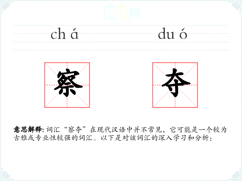 词汇“察夺”在现代汉语中并不常见,它可能是一个较为古雅或专业性较强的词汇。以下是对该词汇的深入学*和分析: