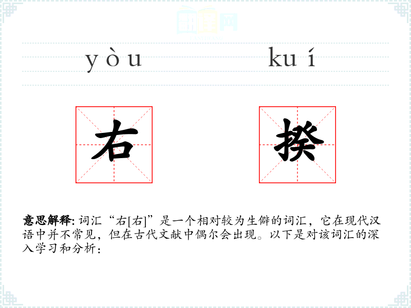 词汇“右[右]”是一个相对较为生僻的词汇,它在现代汉语中并不常见,但在古代文献中偶尔会出现。以下是对该词汇的深入学*和分析: