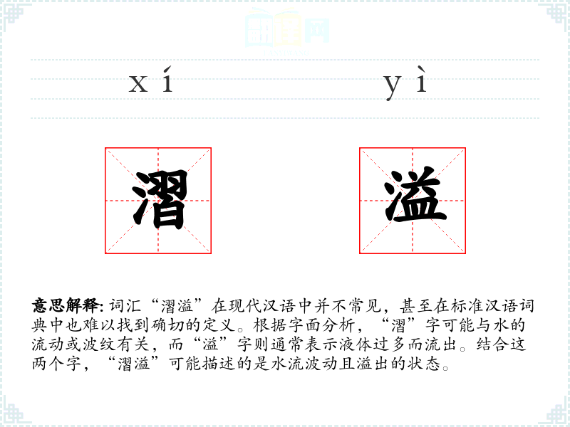 “漝”字在古代文献中较少见,可能与水的动态有关。“溢”字则是一个常用字,表示液体过多而流出。由于“漝溢”不是一个常用词汇,其词源和演变难以追溯。