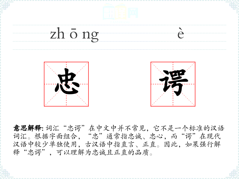 词汇“忠谔”在中文中并不常见,它不是一个标准的汉语词汇。根据字面组合,“忠”通常指忠诚、忠心,而“谔”在现代汉语中较少单独使用,古汉语中指直言、正直。因此,如果强行解释“忠谔”,可以理解为忠诚且正直的品质。