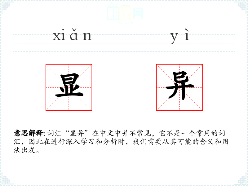 词汇“显异”在中文中并不常见,它不是一个常用的词汇,因此在进行深入学*和分析时,我们需要从其可能的含义和用法出发。