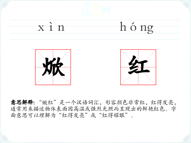 “焮红”是一个汉语词汇,形容颜色非常红,红得发亮,通常用来描述物体表面因高温或强烈光照而呈现出的鲜艳红色。字面意思可以理解为“红得发亮”或“红得耀眼”。