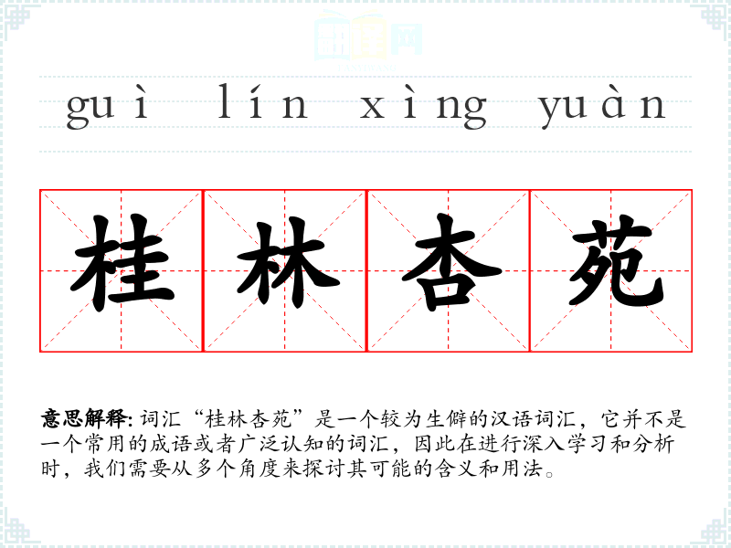 词汇“桂林杏苑”是一个较为生僻的汉语词汇,它并不是一个常用的成语或者广泛认知的词汇,因此在进行深入学*和分析时,我们需要从多个角度来探讨其可能的含义和用法。