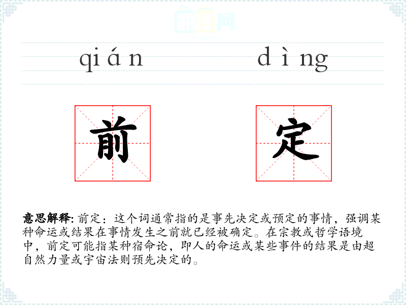 - 专业领域:在哲学或神学中,前定可能涉及更深层次的讨论,如自由意志与宿命的关系。