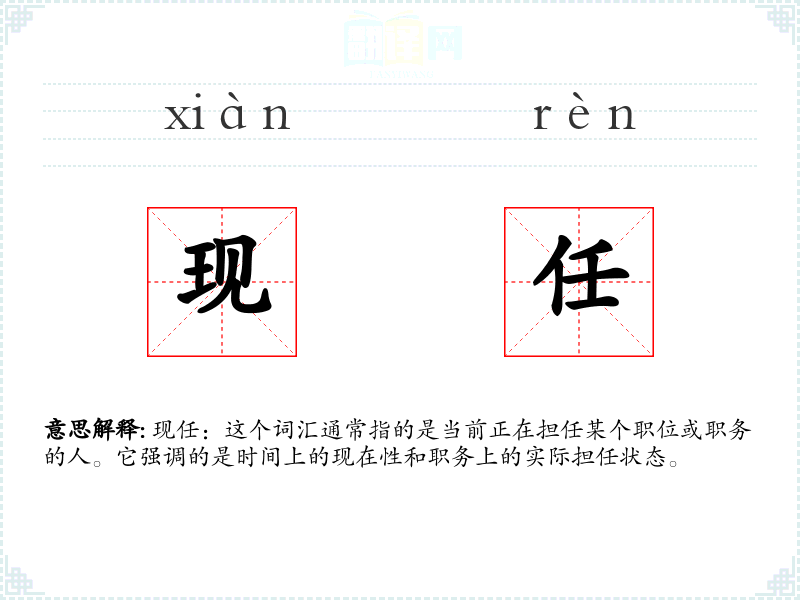 现任:这个词汇通常指的是当前正在担任某个职位或职务的人。它强调的是时间上的现在性和职务上的实际担任状态。