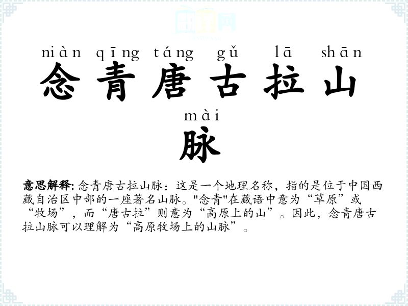 念青唐古拉山脉:这是一个地理名称,指的是位于****自治区中部的一座著名山脉。"念青"在藏语中意为“草原”或“牧场”,而“唐古拉”则意为“高原上的山”。因此,念青唐古拉山脉可以理解为“高原牧场上的山脉”。