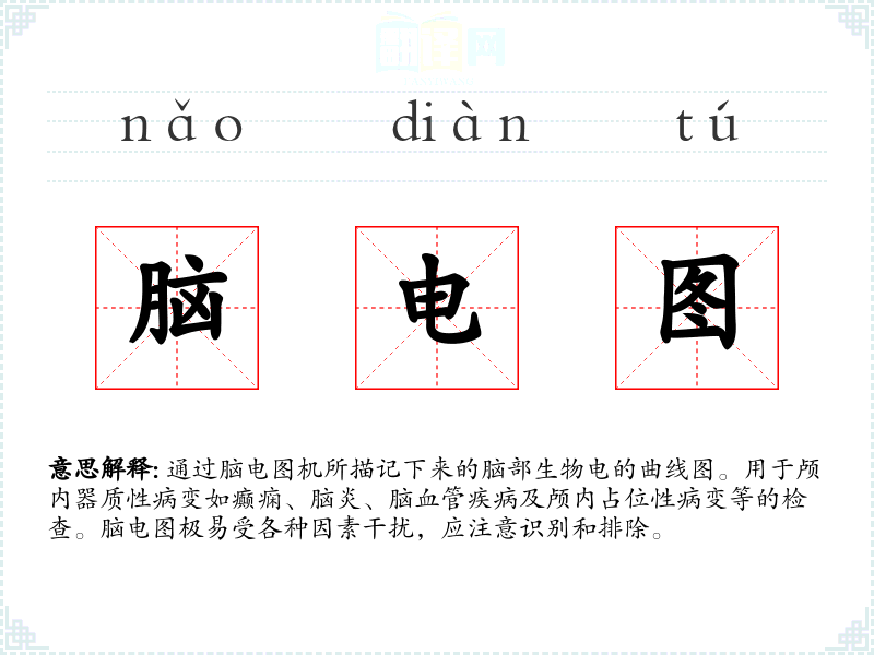 通过脑电图机所描记下来的脑部生物电的曲线图。用于颅内器质性病变如癫痫、脑炎、脑血管疾病及颅内占位性病变等的检查。脑电图极易受各种因素干扰,应注意识别和排除。