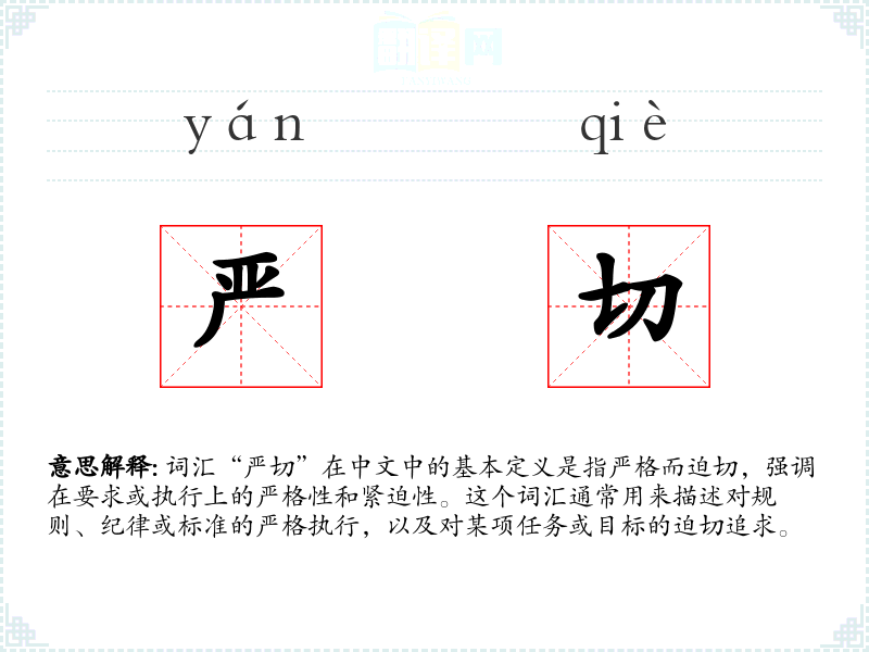 词汇“严切”在中文中的基本定义是指严格而迫切,强调在要求或执行上的严格性和紧迫性。这个词汇通常用来描述对规则、纪律或标准的严格执行,以及对某项任务或目标的迫切追求。