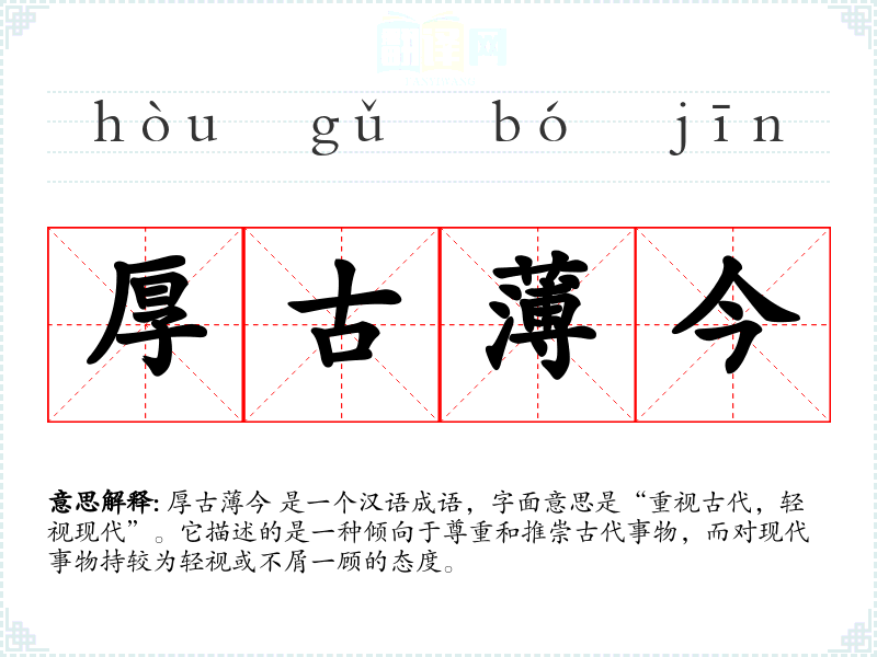 *厚古今** 是一个汉语成语,字面意思是“重视古代,轻视现代”。它描述的是一种倾向于尊重和推崇古代事物,而对现代事物持较为轻视或不屑一顾的态度。