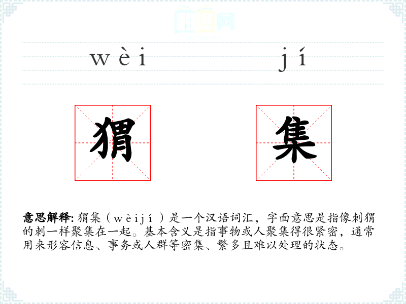 猬集(wèi jí)是一个汉语词汇,字面意思是指像刺猬的刺一样聚集在一起。基本含义是指事物或人聚集得很紧密,通常用来形容信息、事务或人群等密集、繁多且难以处理的状态。