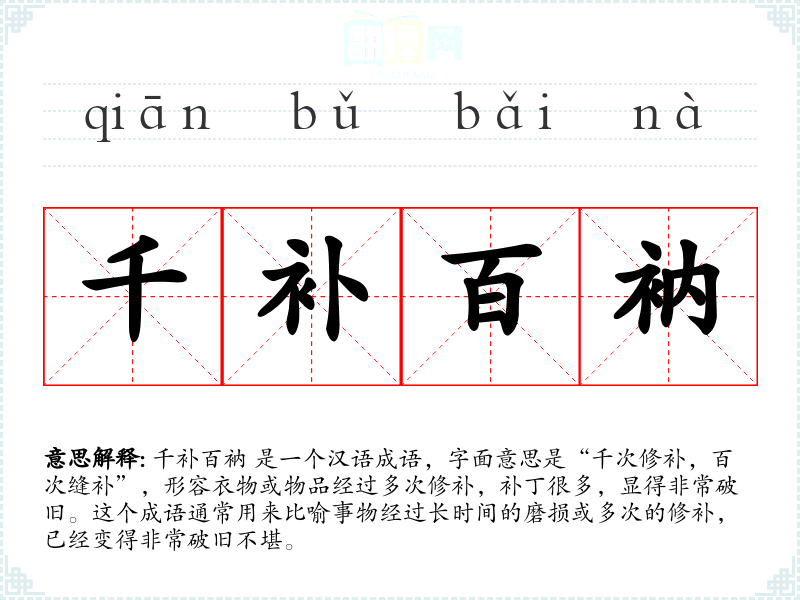千补百衲 是一个汉语成语,字面意思是“千次修补,百次缝补”,形容衣物或物品经过多次修补,补丁很多,显得非常破旧。这个成语通常用来比喻事物经过长时间的磨损或多次的修补,已经变得非常破旧不堪。