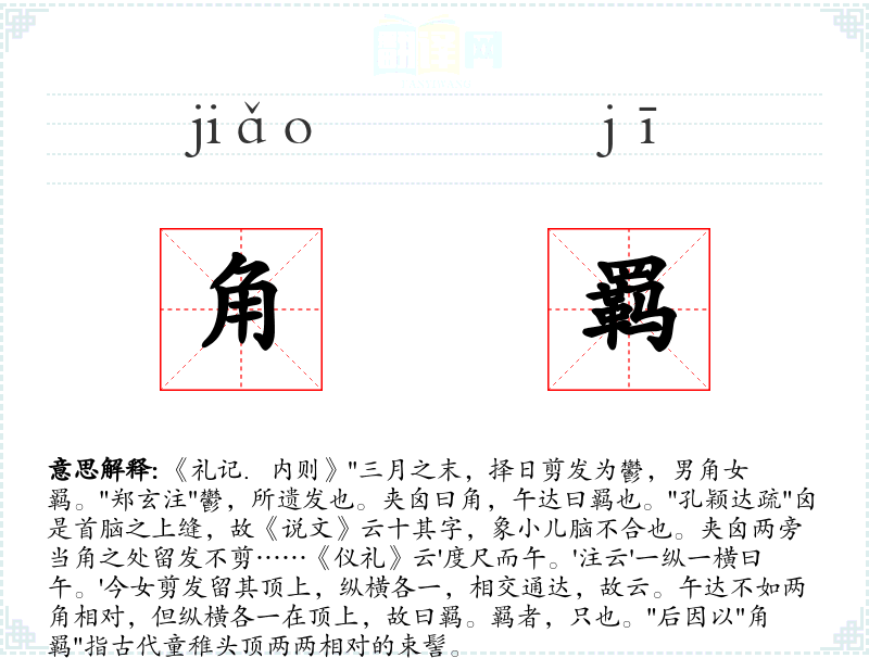 1.《礼记.内则》"三月之末,择日剪发为鬱,男角女羁。"郑玄注"鬱,所遗发也。夹囟曰角,午达曰羁也。"孔颖达疏"囟是首脑之上缝,故《说文》云十其字,象小儿脑不合也。夹囟两旁当角之处留发不剪……《仪礼》云'度尺而午。'注云'一纵一横曰午。'今女剪发留其顶上,纵横各一,相交通达,故云。午达不如两角相对,但纵横各一在顶上,故曰羁。羁者,只也。"后因以"角羁"指古代童稚头顶两两相对的束髻。