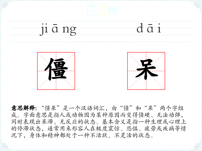 “僵呆”这个词的构成较为直观,由“僵”和“呆”两个常用汉字组合而成。在古代汉语中,“僵”字常用来形容尸体僵硬,而“呆”字则用来形容人的呆滞状态。随着语言的发展,这两个字组合在一起,形成了描述人或动物在某种极端状态下的一种综合表现。