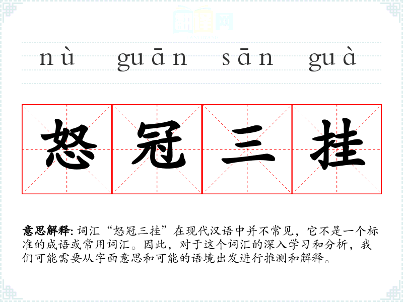 词汇“怒冠三挂”在现代汉语中并不常见,它不是一个标准的成语或常用词汇。因此,对于这个词汇的深入学习和分析,我们可能需要从字面意思和可能的语境出发进行推测和解释。