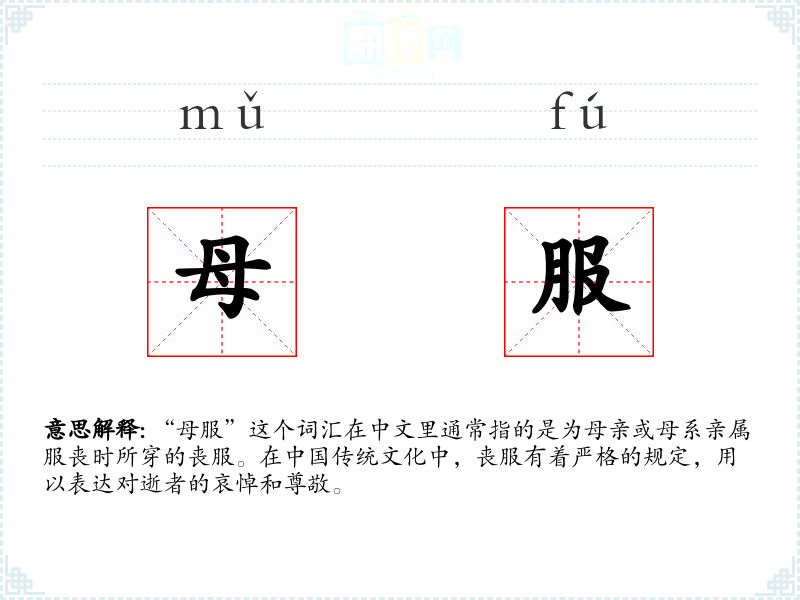 “母服”这个词汇不仅是一个简单的服饰概念,它承载着深厚的文化意义和情感价值。了解和学*这个词汇,有助于我们更好地理解*传统文化中的家族观念和丧葬俗,同时也能够丰富我们的语言表达和文化认知。